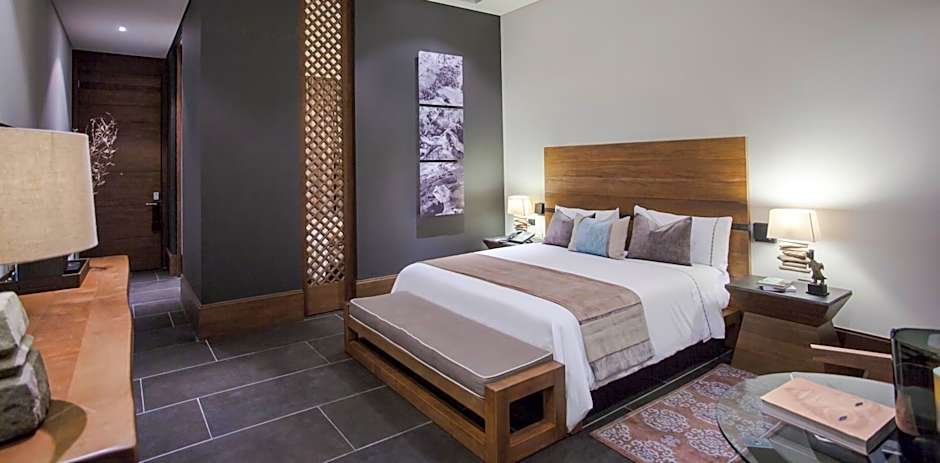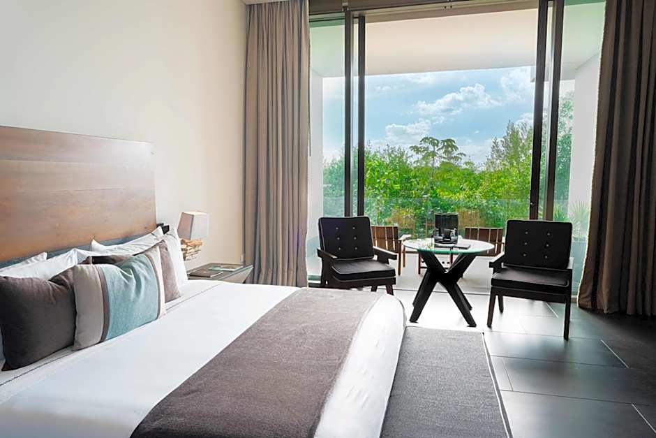 A deluxe one-bedroom suite with king bed and separate living area with sofa. Floor-to-ceiling windows open onto two private terraces providing outdoor space that features a stunning plunge pool and views of the natural mangrove preserve. Suites are located on the ground floor in the residence area. This accommodations features a Nespresso coffee maker, a mini-bar and flat-screen TV. The spacious bathroom features a bath tub with rainfall shower and amenities like bathrobes, slippers and free toiletries. Transportation to this room is via a golf cart available 24/7. Area: 1,475 sq. ft. / 449 ft². Up to three guests, ideal for families, please note that the rate is based on 2 adults (see Hotel Policies)